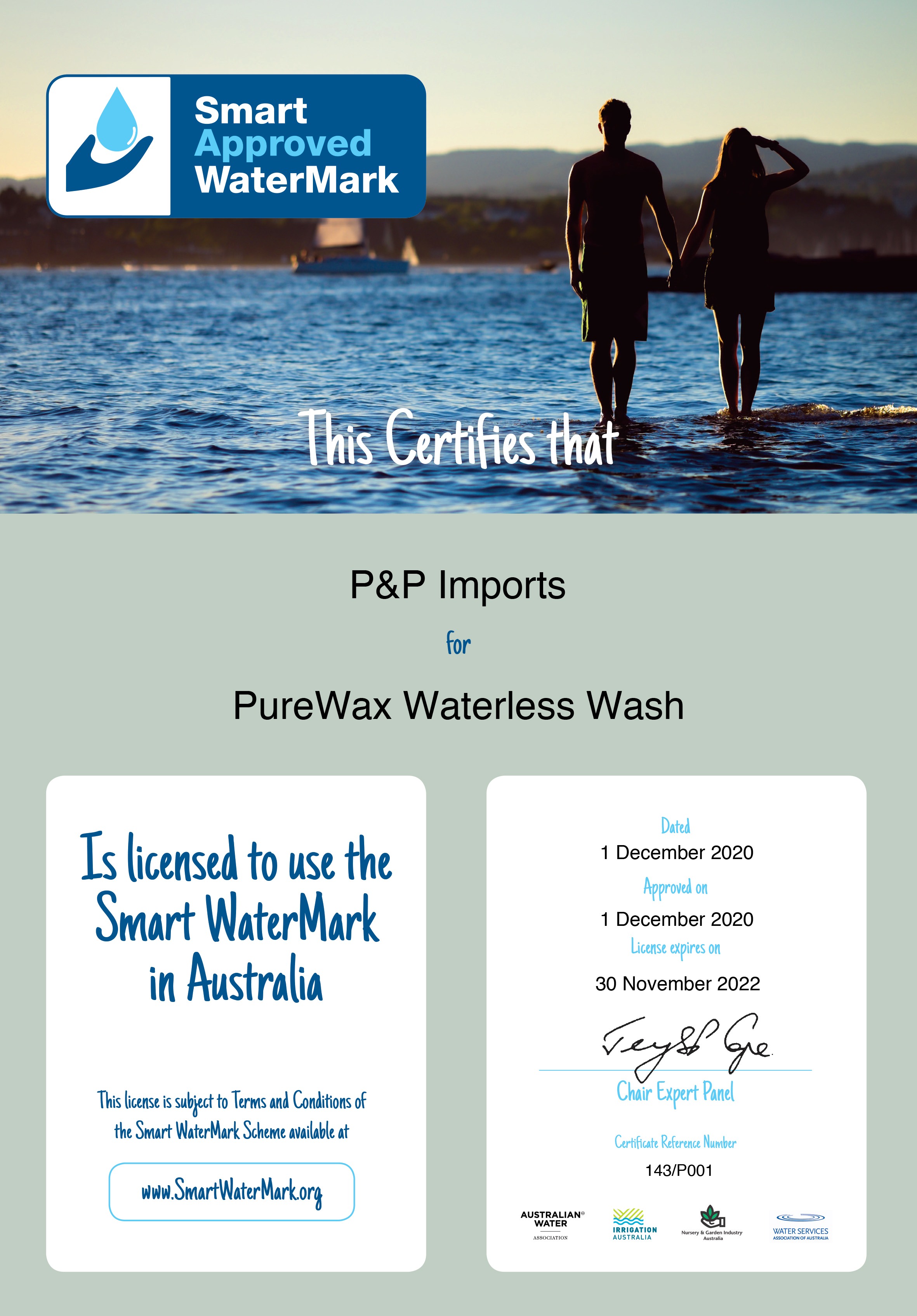 - Our PureWax Waterless Wash / Detail has helped save the thousands of litres of water used for a comparable wash with water (saving between 10-100L per wash).